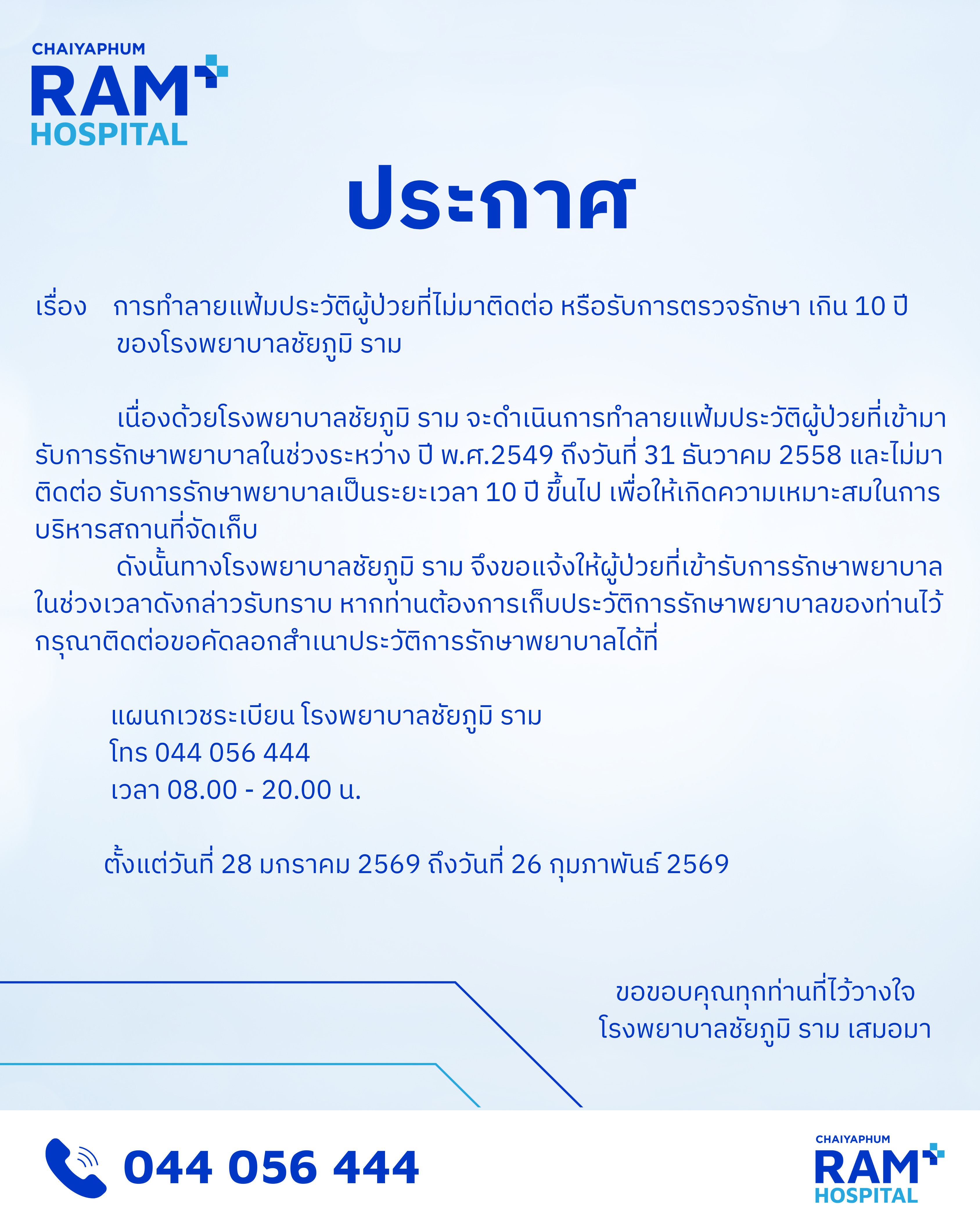 ประกาศการทำลายแฟ้มประวัติผู้ป่วยที่ไม่มาติดต่อหรือรับการตรวจรักษาเกิน 10 ปี
